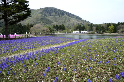 芝桜まつりにムスカリも活躍・・・右側の畑に白花のムスカリが・・・